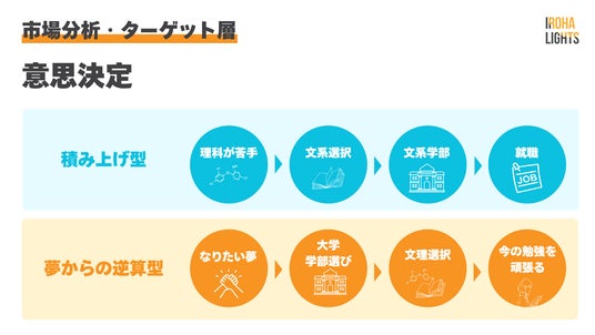 学校の中だけではリアルな仕事観を知る機会はなく、したくないことはあるが、したいことが明確じゃない状態で夢が見つからないまま、文理選択や進学先を選んでいる人が大半です。その結果今は、理科が苦手だから文系選択をして、文系学部、文系就職というような積み上げ型の未来になる人が多いですが、いろはライトが目指すのは「夢からの逆算型」の意思決定です。