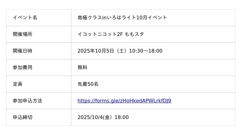 南極クラスinいろはライト10月イベント - 岡山駅前のイコットニコット2F ももスタにて開催