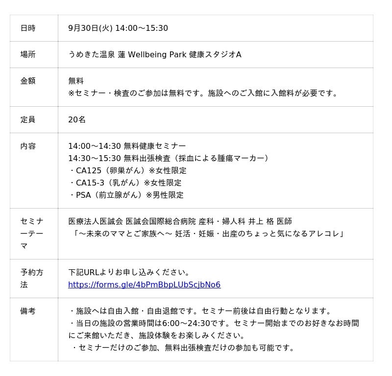妊活・妊娠・出産についてのセミナーと腫瘍マーカーの無料出張検査を同時開催