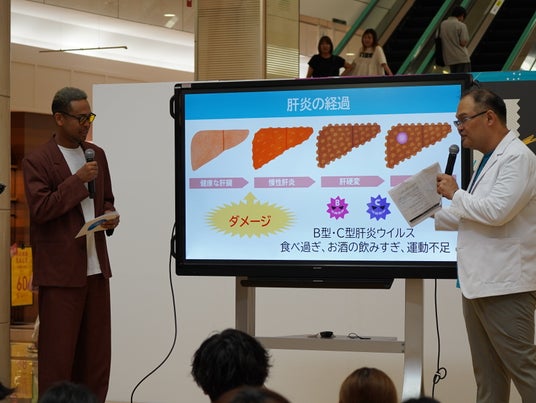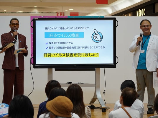 磯田氏は肝炎がどのような病気であるかをわかりやすく説明した上で、「近年では、ウイルス性だけではなく過度な飲酒や食べ過ぎなど、生活習慣が原因の肝炎が大きな問題となっています。」と述べました。肝炎ウイルスに感染していると知らずに過ごしている人も多いという話を受けたEXILE NESMITH氏は、「肝臓は“沈黙の臓器”と言われており、自覚症状がないまま病気が進行することがあります。放置すると肝がんなど命にかかわる病気につながることもあるので注意が必要です。」と肝炎ウイルス検査の重要性を伝えました。会場では無料の肝炎ウイルス検査が実施されており、 「ぜひ、この機会に検査を受けてください、まずは“知ること”がとても大切です!」と呼びかけました。