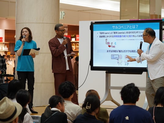 「筋肉量と握力には相関関係があります。」という磯田氏の説明を受けて、EXILE NESMITH氏が握力測定に挑戦しました。握力測定では、サルコペニアの可能性がある基準として男性は28キログラム未満、女性は18キログラム未満であるとされていますが、EXILE NESMITH氏は「58.7キログラム」を記録。年齢の平均値を大きく上回る結果に、磯田氏も「ここまで高い数値は素晴らしいですね!体を鍛えることは肝臓の健康にもつながります。また、肝臓を大事にすると筋肉量も増えます!」と、EXILE NESMITH氏の結果に太鼓判を押しました。このコメントを受けて、EXILE NESMITH氏は「握力から簡単に筋肉量や自身の健康状態がわかるのは良いですね。皆さんもぜひ測定してみてください!」と会場に呼びかけました。会場には実際に握力測定コーナーも設けられており、多くの人でにぎわっていました。