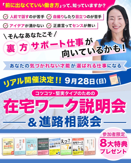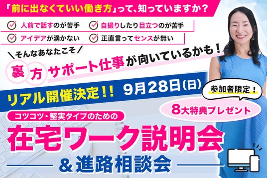 在宅ワークや副業への関心は高まっていますが、「自分に合った働き方が分からない」「相談できる人がいない」といった悩みも多く聞かれます。そうした課題を解決するために企画されたのが『リアル説明会&進路相談会』です。