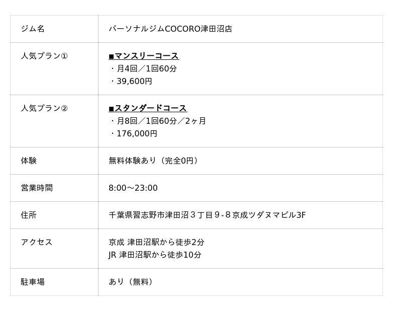「心理面も含めたサポートを受けたい方は、パーソナルジムCOCORO津田沼店のような選択肢も検討してみましょう」