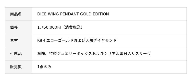 本商品は、2022年に発売し好評を博した『DICE WING PENDANT』(シルバー製、税込69,960円、99個限定生産)の最後の1点を、K9イエローゴールドと天然ダイヤモンドで特別に仕上げた、世界にただ一つの作品です。