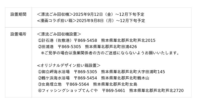 一般社団法人くまもと海のミライは、人気漫画「放課後ていぼう日誌」(秋田書店刊)とコラボして漫画の舞台である熊本県葦北郡芦北町で漁港に海に漂流するごみの回収機設置や経路調査を進めています。また継続事業としてオリジナルデザインの拾い箱も設置します。この活動は、日本財団が推進する海洋ごみ対策プロジェクト「海と日本プロジェクト・CHANGE FOR THE BLUE」の一環で開催するものです。