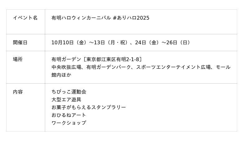 住友不動産商業マネジメント株式会社(本社:東京都新宿区、代表取締役社長:山本 直人)が運営する「住友不動産 ショッピングシティ 有明ガーデン」(東京都江東区)では、2025年10月10日(金)から、今年で6回目を迎える秋の恒例イベント『#ありハロ2025』を開催いたします。