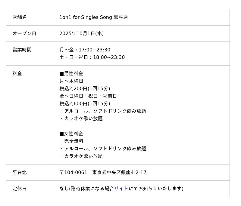 ■新店舗「1on1 for Singles Song 銀座店」の概要