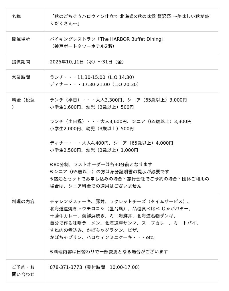 株式会社アベストコーポレーション(代表取締役:松山 みさお)が運営する神戸ポートタワーホテル(支配人:薩摩利幸、兵庫県神戸市中央区)は、バイキングレストラン「The HARBOR Buffet Dining(ザ・ハーバー ビュッフェダイニング)」で2025年10月1日(水)から31日(金)まで、「秋のごちそうハロウィン仕立て 北海道×秋の味覚 贅沢祭 ~美味しい秋が盛りだくさん~」を開催します。9月に開催し好評だった「北海道フェア」の開催を延長し、さらに「ハロウィンメニュー」と「チャレンジステーキ」を加え、パワーアップした豪華バイキングを3,000円※(税込)~ご提供いたします。