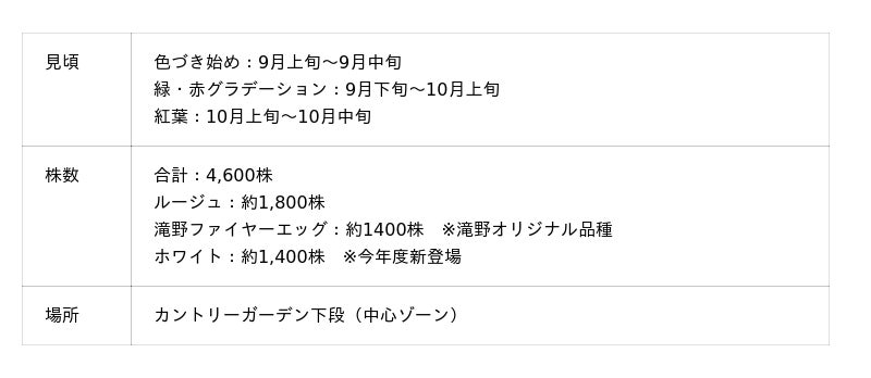 また、今年は定番の「ルージュ」や滝野オリジナル品種の「滝野ファイヤーエッグ」に加え、紅葉しない品種「ホワイト」が初登場!