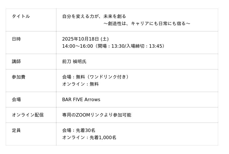 仕事にも日常にも応用できる発想力・行動力を、ぜひこのセッションでご体感ください。変化の時代をしなやかに生きるための、新しい思考のスイッチ「Creative Desire」がきっと見つかります。