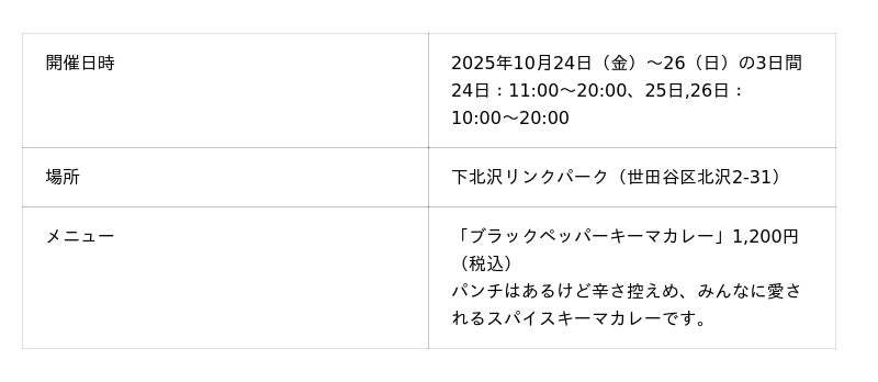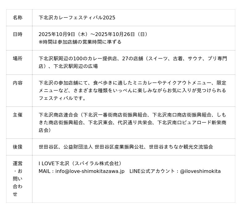 デジタルで未来最適をリードするスパイラル株式会社(東京都港区、代表取締役グループCEO 佐谷 宣昭)のまちおこしDXカンパニーと下北沢商店連合会(会長 長沼 洋一郎)は、2025年10月9日(木)から10月26日(日)までの18日間、「下北沢カレーフェスティバル2025」(以下「下北沢カレーフェス」)を開催いたします。このたび、イベントをさらに楽しめる最新情報を公開しましたので、お知らせいたします。