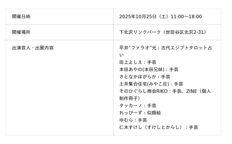 それぞれのブースにて占いを実施したり、絵画などのアート作品を出展したりします。気に入っていただけた作品を購入することもできます。芸人以外の新たな一面も見られる機会を、ぜひお見逃しなく。