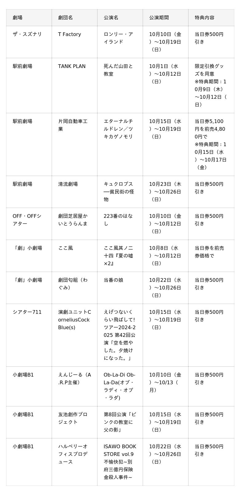 下北沢カレーフェスに参加し「I LOVE下北沢アプリ」を提示すると、ザ・スズナリ、駅前劇場、OFF・OFFシアター「劇」小劇場、シアター711、小劇場B1で開催される演劇の一部が割引料金でご覧いただけます。また、観劇するとカレースタンプラリーのスタンプが1つもらえます。