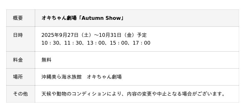 沖縄美ら海水族館(所在地:沖縄県国頭郡本部町、館長:佐藤 圭一)の「オキちゃん劇場」では、2025年9月27日(土)より、新たに「Autumn Show(オータムショー)」を開催いたします。