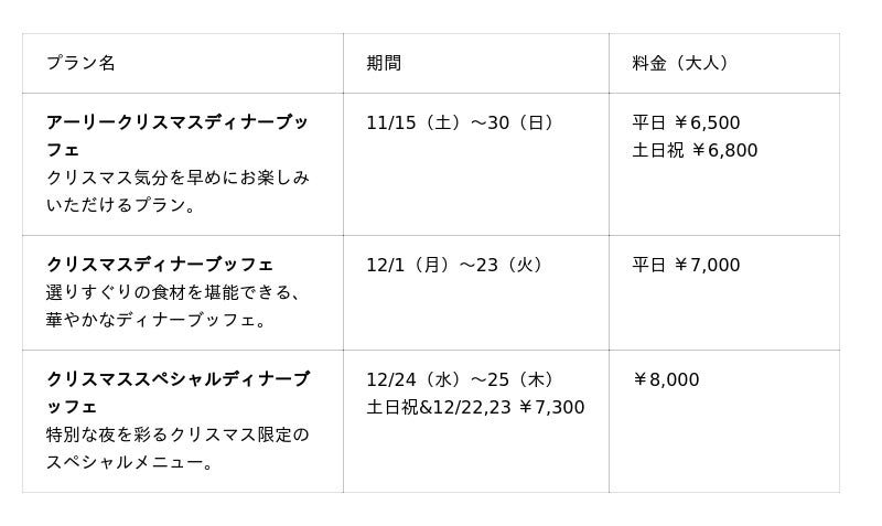 バラエティ豊かなクリスマスディナーブッフェを開催 大切な人とのクリスマスを彩る期間限定のスペシャルプランも登場
