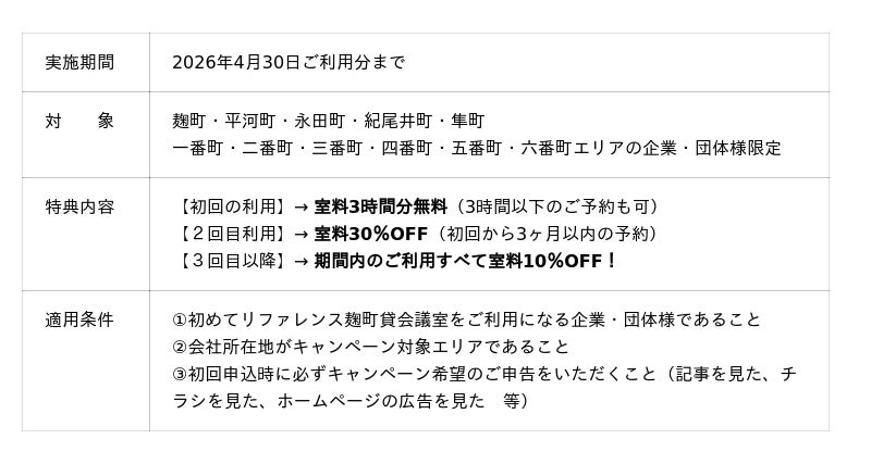 今回のキャンペーンは、地域の皆さまにまずは実際にご利用いただき、会議室の快適さを体感していただくことを目的に企画したもの。初回はお試し価格で、さらにリピート利用で期間中は継続してお得が続きます。新しい会議室を体験いただけるこの絶好の機会に、ぜひ「リファレンス麹町貸会議室」をご活用ください。