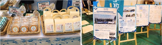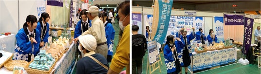 オリジナルアイテムの販売会では生徒たち自ら売場に立ち、プロジェクトで学んだ海洋ごみ問題について来場者に直接伝えました。来場者は「間伐材コースター」や「オリジナルいかせんべい」を手に取り、生徒たちの話に熱心に耳を傾けていました。