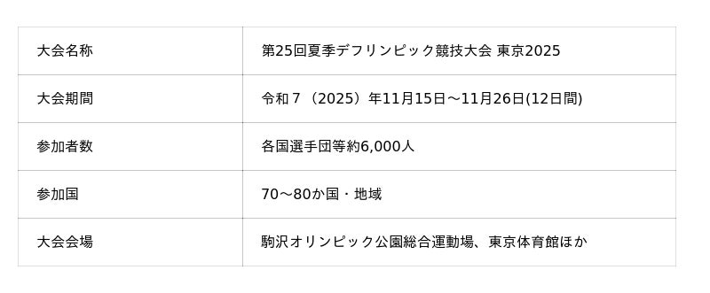 にくい人のための国際スポーツ大会」のことです。4年に1度、夏季大会と冬季大会がそれぞれ開かれ、耳のきこえない人のために様々な工夫がされています。今回の東京大会は100周年大会です。