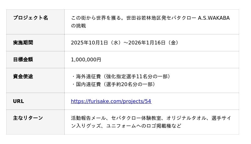 東京都世田谷区若林地区を拠点に活動するセパタクローチーム『A.S.WAKABA』(代表:平瀬 律哉)は、2026年に日本で開催される国際複合競技大会での金メダル獲得を目指し、選手の活動資金(海外・国内遠征費)を募るクラウドファンディングプロジェクトを2025年10月1日(水)より開始しました。本プロジェクトは、日本代表強化指定選手を男女11名輩出するなど国内屈指の実力を誇りながらも、遠征費の多くを選手が自己負担している現状を打破し、選手が競技に一層専念できる環境を整えることを目的としています。