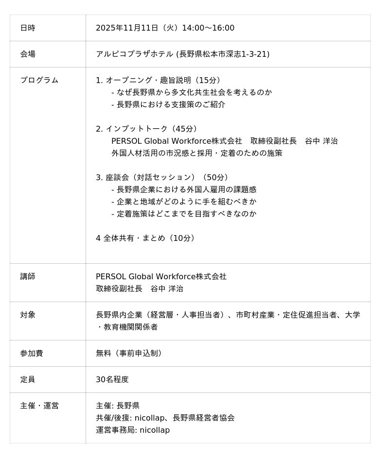 本座談会では、外国人材の採用・定着に関する最新情報や実践的なノウハウを提供する他、現場のリアルな課題を持ち寄ることで、長野県から多文化共生社会を実現していくための第一歩を築きます。