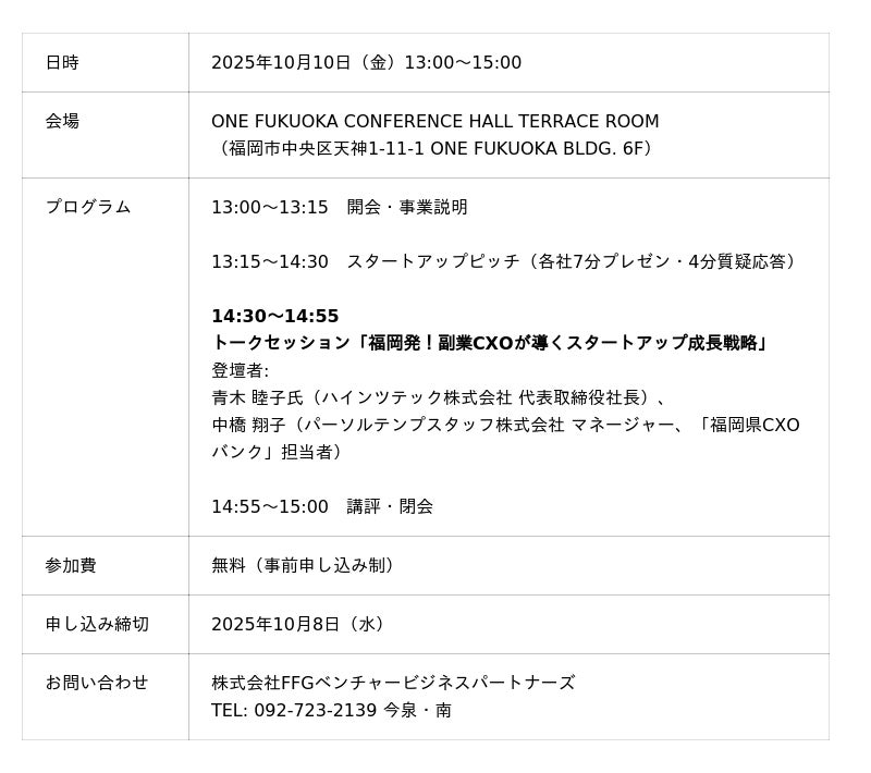 本イベントは、株式会社FFGベンチャービジネスパートナーズ(本社: 福岡県福岡市、代表取締役社長: 吉田 泰彦)とパーソルテンプスタッフの共催で、NEDO/MPM(大学発スタートアップにおける経営人材確保支援事業)の一環として実施されます。九州地域の大学発スタートアップと経営人材のマッチングを促進し、資金調達や事業パートナーとの出会いの場を創出することを目的としています。
