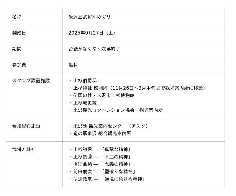 山形県米沢市の上杉文化エリアで、歴史ファンも旅好きも楽しめる新しい体験型周遊企画「米沢五武将印めぐり」が、2025年9月27日(土)より始まりました。