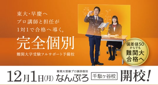 河合塾グループの株式会社キョーイク(本社:愛知県名古屋市、代表取締役:矢追俊和、以下キョーイク)は、中学生から高卒生を対象とした新たな難関大学受験フルサポート予備校『なんぷろ』千駄ヶ谷校を2025年12月1日に開校します。医系専門予備校「メディカルラボ」の20年以上の指導ノウハウを生かし、プロ講師による1対1の完全個別指導と効果的な問題演習を掛け合わせ、偏差値50からでもトップレベルの難関大学合格へと導きます。