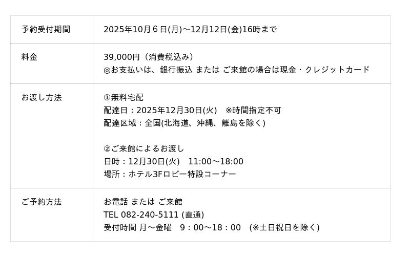 オリエンタルホテル広島(所在地:広島市中区田中町6-10)では、ホテルオリジナルおせち料理「和洋中おせち三段重」の予約受付を2025年10月6日(月)より開始いたします。