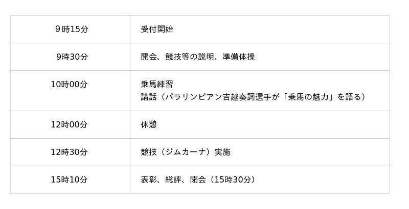 当日は、乗馬練習を行った上で競技会を実施するほか、現役パラリンピアンが乗馬の魅力を語る講話もあり、乗馬経験を問わず、楽しくご参加いただけるインクルーシブな大会です。皆様、奮ってご応募ください!