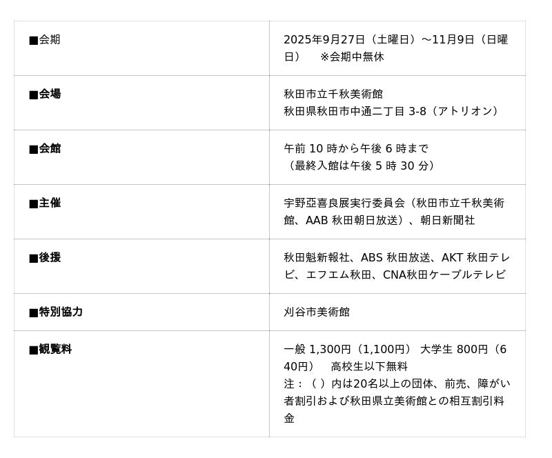 ■秋田市立千秋美術館 Tel:018-836-7860 Fax:018-836-7862 担当:村田、菅沼メディア等で展覧会情報をご紹介いただく際には、基本情報確認のため、事前に上記までご連絡ください。
