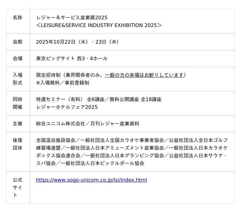 『月刊レジャー産業資料』をはじめとする各種経営情報誌を発行する綜合ユニコム株式会社(本社 東京都中央区)では、2025年10月22日(水)・23日(木)の両日、東京ビッグサイト 西3・4ホールにて「レジャー&サービス産業展2025」を開催いたします。