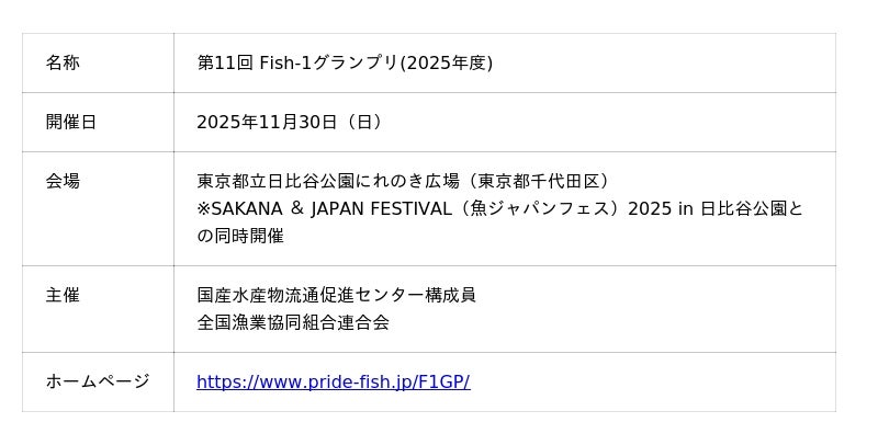 2025年11月30日(日)に、東京都立日比谷公園にれのき広場にて、日本の水産物に光を当てる“魚の祭典”「第11回Fish-1グランプリ(2025年度)」(主催・国産水産物流通促進センター構成員 全国漁業協同組合連合会)を開催いたします。国産水産物料理コンテストには全国33団体・企業の応募があり、厳正な書類審査の結果、出場する8団体とメニューが決定しました。当日に一般来場者と審査員の投票により決定するグランプリを目指します。累計来場者250万人に上る日本最大級の魚介グルメフェスティバルである「SAKANA&JAPAN FESTIVAL(魚ジャパンフェス)2025 in 日比谷公園」(主催・魚ジャパンフェス実行委員会 会期・11月28~30日の3日間)との同時開催で最終日に実施。リニューアルにより生まれ変わった日比谷公園での開催は2022年11月以来3年ぶりです。