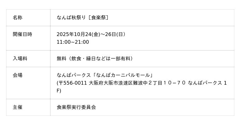 2025年10月24日(金),25日(土),26日(日)の3日間「なんば秋祭り[食楽祭]」をなんばパークス「なんばカーニバルモール」(大阪市浪速区)にて開催いたします。