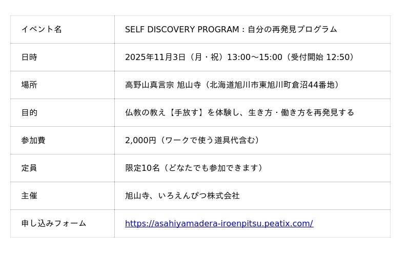 高野山真言宗 旭山寺(所在地:北海道旭川市、副住職:渋谷智海)と、キャリアセミナー・広報コンテンツ制作を行ういろえんぴつ株式会社(所在地:北海道旭川市、代表取締役:大田原裕希)は、現代人が抱える生き方・働き方の迷いに対し、仏教の重要な教えである【手放す】を体験する共同ワークショップ「SELF DISCOVERY PROGRAM:「自分」の再発見プログラム」を、2025年11月3日(月・祝)に旭山寺にて開催します。