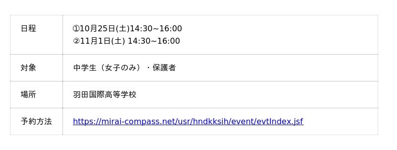 今後も、秋のイベントは続いてまいります!「秋の学校説明会」は、10月25日(土)・11月1日(土)に開催します!教育内容やスクールライフに加えて、重要な入試基準などをお伝えします。さらにWINGSスタッフ・教職員との交流、校舎見学をとおして、羽田国際の雰囲気を感じていただけるプログラムになっています。また同日には、別プログラムとして「幼児教育コース特別体験会」を同時開催!幼児教育コースの魅力をお伝えするための体験会や施設見学をご用意していますので、ぜひご参加をお願いいたします!