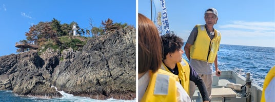 碁石埼灯台を拠点とした教育・体験プログラムの構築を目的に、実際の行程を体験・検討。船上からの碁石埼灯台観察や地域の漁業従事者・ツアーガイドの話を伺いながら、11月8日(土)に予定する親子向け教育プログラム体験ツアーの内容検証と調整を行いました。