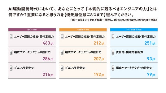 Q. AI駆動開発時代において、 あなたにとって 「本質的に残るべきエンジニアの力」とは何ですか?重要になると思う力を【優先順位順に3つまで】選んでください。(n=285 選択肢に対して1~3位を単一選択し、1位×3pt、2位×2pt、3位×1ptで換算)