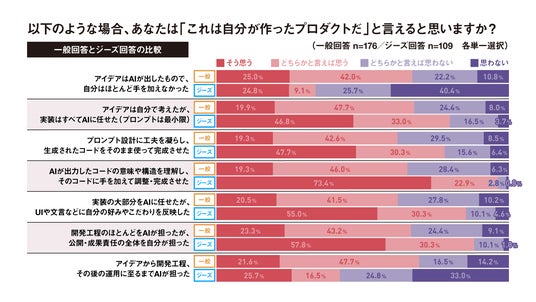 一方、ジーズ回答者では2位に「生成AIがどの程度関わったとしても、『自分が作った』と言いづらいとは感じない」が入りました。この回答をした方のフリーコメントでは「AIをツールと捉え、自分の意思と責任のもとに作られたものは自分のプロダクトである」という傾向が共通して強く示され、AIの関与度よりも、「自分が意思を持ち起点となっているかどうか」を重視していることが特徴的です。