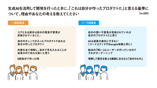 一方でジーズ回答者は「AIをどれだけ使っても、自分の想いや意志が反映されていれば」「自分の考えや判断をもとに開発を進めているか」といった、“意思や思想が反映されているか”という質的な基準を重視する傾向が際立っています。