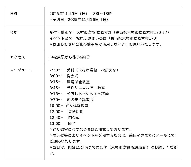 一般社団法人大村湾ワンダーベイは、釣りを通して大村湾の豊富な海洋資源に触れ、大村湾に親しみを持ってもらうとともに、水難事故や海の環境についての課題を知り「自分ごと」化してもらうことを目的に、2025年11月9日(日)に「ワンダーフィッシング~楽しく学ぶ、釣り人のそなえ~」を開催いたします。大村湾ワンダーベイプロジェクトは、地元大村湾を身近に感じ、海の環境について考えるきっかけを創出していきます。