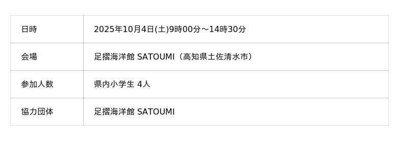 一般社団法人 海と日本プロジェクト in 高知は2025年10月4日(土)、「高知オーシャンキッズスクール 西部エリア編 海の宝石箱 竜串湾を守ろう!」を足摺海洋館SATOUMIにて開催いたしました。