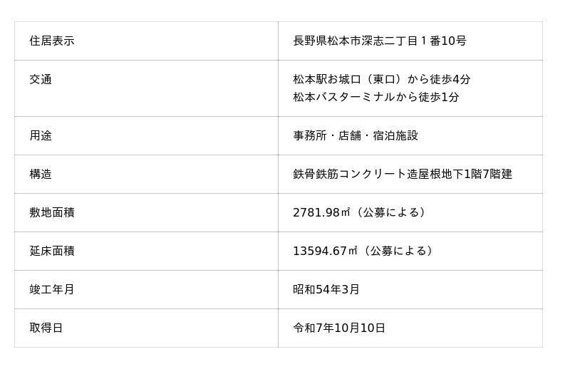 株式会社エム・ケー・ケー(本社:長野県松本市、代表取締役:藤巻好仁、以下「当社」)は旧井上百貨店跡の土地建物を取得しましたのでお知らせいたします。