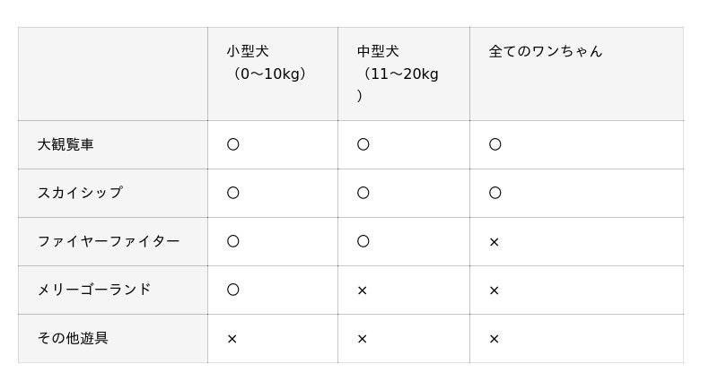 ・ワンちゃんのサイズや体重によって、利用が制限されるアトラクションがございますので、事前にご確認ください。