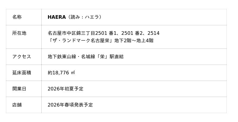 J.フロント リテイリング株式会社、株式会社大丸松坂屋百貨店、株式会社パルコ、 J.フロント都市開発株式会社は、2026年初夏、名古屋市中区錦三丁目において開発中の「ザ・ランドマーク名古屋栄」の地下2階~地上4階にて、新たな商業施設「HAERA(ハエラ)」を開業いたします。