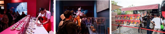 (写真左から)大盛況だったライブクッキングショー、本物のナスカの土器を展示、連日長蛇の列ができたフードトラック