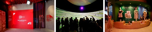 (写真左から)ペルーブランドロゴ、ペルーの名所を魅せる巨大スクリーン、ペルーの魅力を発信する展示