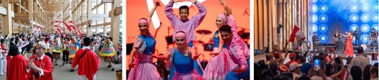 (写真左から)大屋根リング下のパレード、ペルー国立フォルクローレバレエ団、 Mimy & Tony Succarによる特別公演