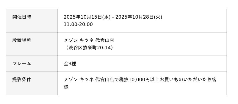 キタムラ・ホールディングス グループのピックハイブ株式会社(本社:東京都新宿区、代表取締役社長 兼 COO:大迫 由典)が運営するセルフフォトブランド「Photomatic」は、フランスのエレガンスを現代的な日本の視点から提案するライフスタイルブランド「Maison Kitsune」と、スコットランドで設立された英国発のライフスタイルブランド「HUNTER」との初のコラボレーションを記念して、メゾン キツネ 代官山店にセルフフォトブースを設置します。10月15日(水)から10月28日(火)の期間、メゾン キツネ 代官山店で税抜10,000円以上お買いものいただいたお客様は、本コラボレーションを記念した特別なフォトフレームでの撮影をお楽しみいただけます。
