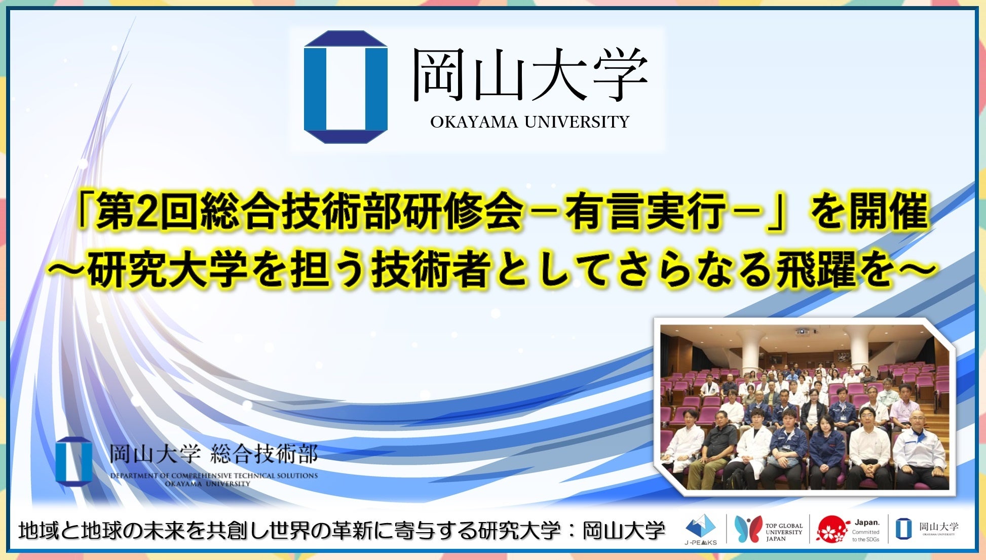 国立大学法人岡山大学(本部:岡山市北区、学長:那須保友)の技術統括監理本部を構成するひとつである総合技術部は、2025年9月9日、「第2回総合技術部研修会-有言実行-」を鹿田キャンパス 鹿田会館・講堂とオンラインのハイブリッド形式で開催しました。
