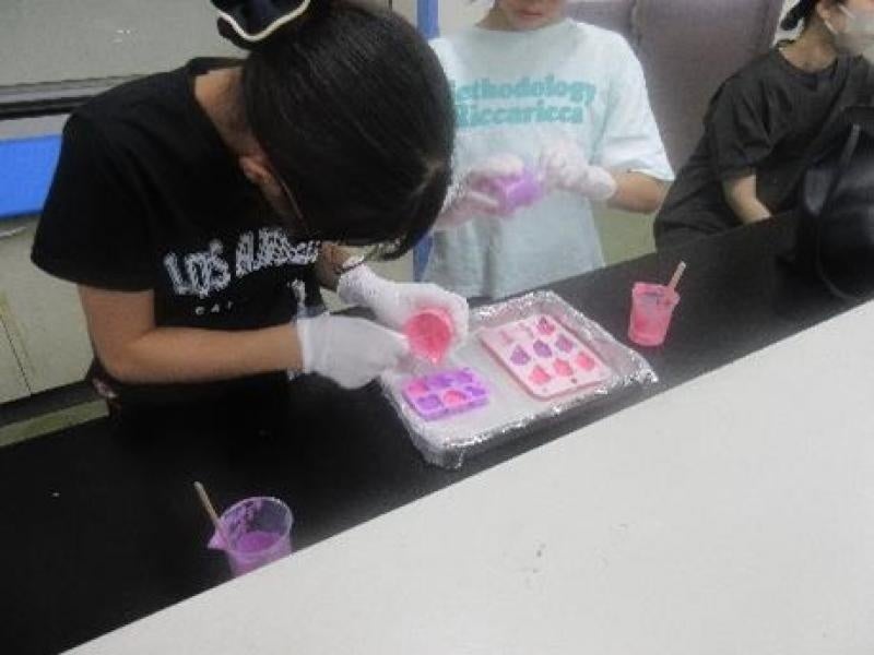 今年度の新しいテーマとして、本学学術研究院環境生命自然科学学域の沖原巧講師の協力のもと「消しゴムを作ろう」を実施しました。ポリ塩化ビニル(プラスチック)と、可塑剤(プラスチックが溶ける油)、炭酸カルシウムを混ぜてオリジナルの消しゴムを作りました。炭酸カルシウムはチョークの粉に岡山県産の牡蠣の殻を砕いたものを混ぜてあり、それぞれ好きな色を選んで量り取りました。可塑剤はこまごめピペットを使用して加え、全てを混ぜてから真空ポンプで脱気しました。参加者は、脱気中に泡が出て全体が膨らんできたように見える様子を興味深そうに観察していました。その後、シリコン型に流し込み、150℃の恒温槽で30分加熱し、氷水に漬けて固まるのを待って取り出しました。思った通りにできたものや固まり切らないものもありましたが、失敗も実験の成果の一つとして学んだ様子でした。